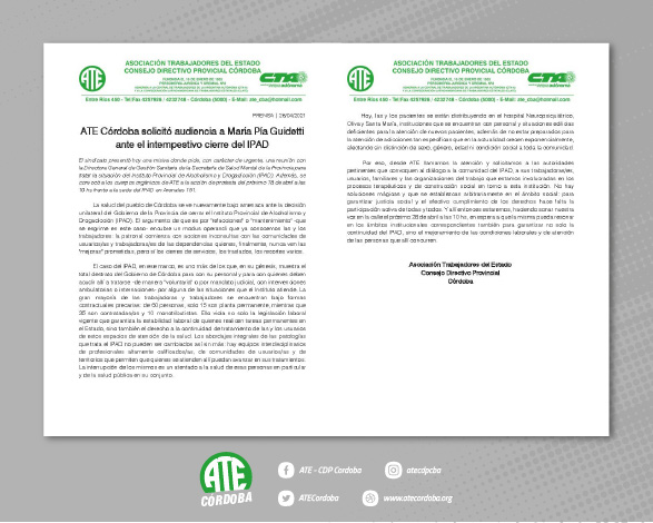 “Por eso, desde ATE llamamos la atención y solicitamos a las autoridades pertinentes que convoquen al diálogo a la comunidad del IPAD, a sus trabajadoras/es, usuarios, familiares y las organizaciones del trabajo que estamos involucradas en los procesos terapéuticos y de construcción social en torno a esta institución”, comunicó Giuliani. “No hay soluciones mágicas y que se establezcan arbitrariamente en el ámbito social: para garantizar justicia social y el efectivo cumplimiento de los derechos hace falta la participación activa de todas y todos. Y por eso estaremos haciendo sonar nuestra voz en la calle el próximo 28 de abril a las 10 hs, en espera a que la misma pueda resonar en los ámbitos institucionales correspondientes también para garantizar no solo la continuidad del IPAD, sino el mejoramiento de las condiciones laborales y de atención de las personas que allí concurren”, concluyó el Secretario General de ATE Córdoba.