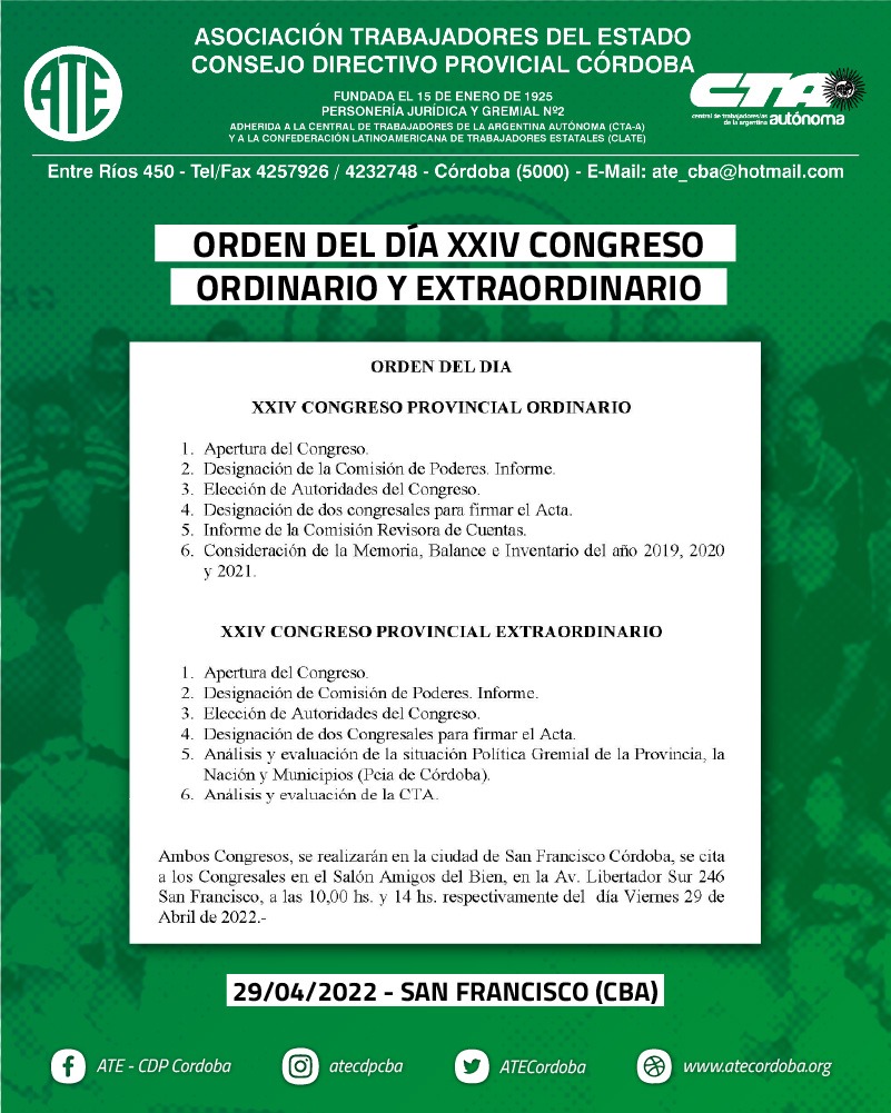 Después de dos años de pandemia de Covid19 que disidió al Ministerio de Trabajo de la Nación a interrumpir la realización de congresos de todas las organizaciones sindicales, hoy dio comienzo el XXIV Congreso Provincial Ordinario y Extraordinario de ATE Córdoba, en la ciudad de San Francisco.