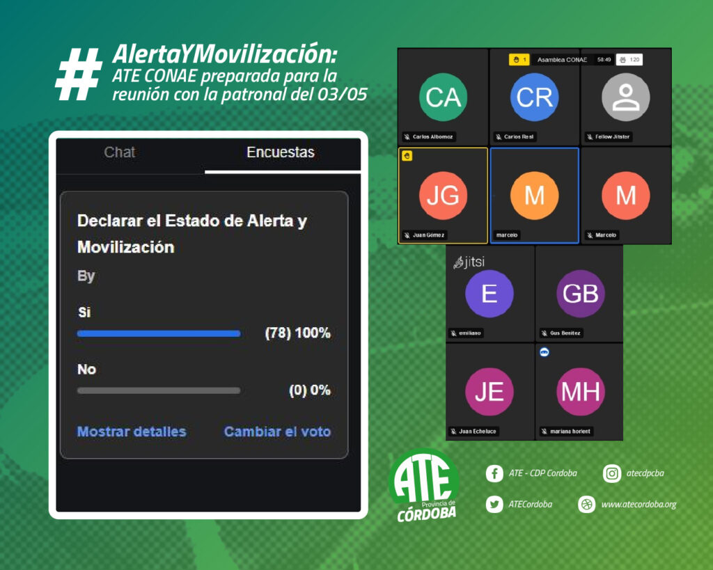 Las y los trabajadores de la Comisión Nacional de Actividades Espaciales (CONAE) y de la empresa nacional VENG realizaron hoy una Asamblea virtual donde decidieron, por unanimidad, declarar el estado de Alerta y Movilización de cara a la reunión que mañana se realizará con la patronal en Buenos Aires -de la cual participarán delegadas/os tanto de Córdoba como de CABA-.