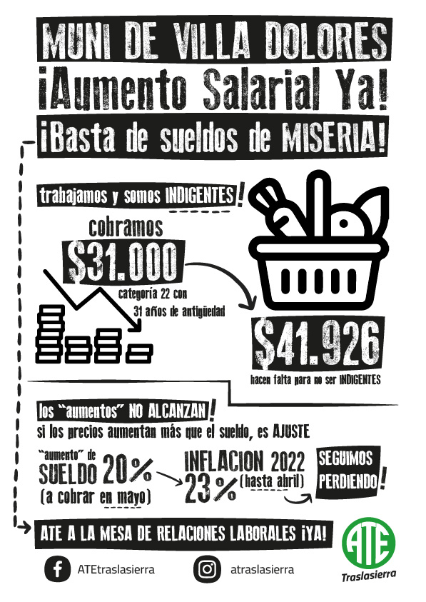 Frente a la escalada inflacionaria que destruye el poder de compra de las familias y ante una situación histórica de salarios bajísimos que no superan la línea de la indigencia, las y los trabajadores municipales de la ciudad de Villa Dolores reclaman la urgente constitución de una mesa paritaria municipal, donde ATE Traslasierra pueda trasladar las necesidades inmediatas del sector.