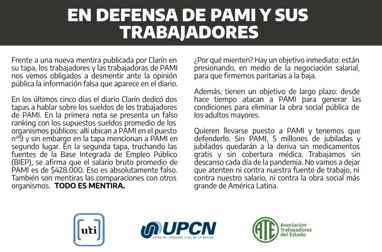 En el comunicado puede leerse: “En los últimos cinco días el diario Clarín dedicó dos tapas a hablar sobre los sueldos de los trabajadores de PAMI. En la primera nota se presenta un falso ranking con los supuestos sueldos promedio de los organismos públicos: allí ubican a PAMI en el puesto n°9 y sin embargo en la tapa mencionan a PAMI en segundo lugar. En la segunda tapa, truchando las fuentes de la Base Integrada de Empleo Público (BIEP), se afirma que el salario bruto promedio de PAMI es de $428.000. Eso es absolutamente falso. También son mentiras las comparaciones con otros organismos. TODO ES MENTIRA”.