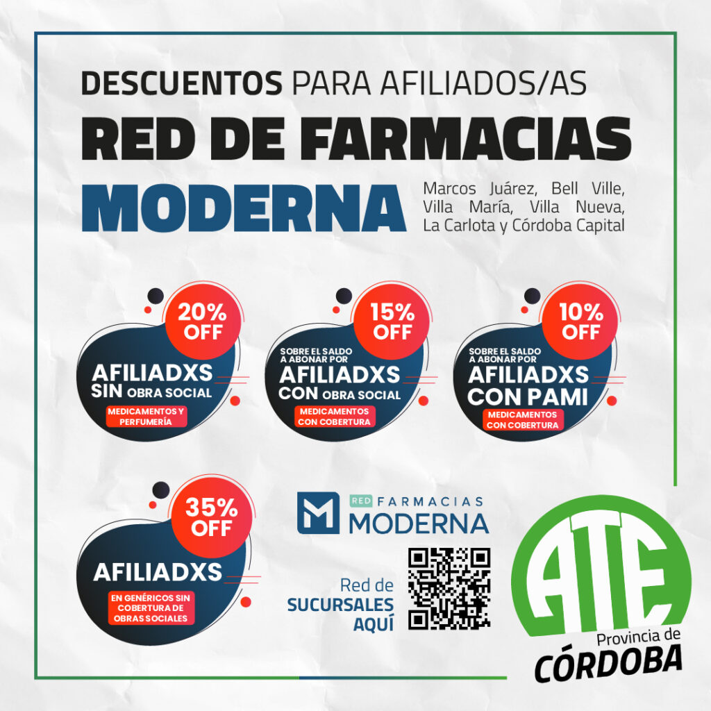 A partir del trabajo de la Secretaría de Acción Social de ATE Córdoba, las y los afiliados a nuestro sindicato de toda la provincia podrán gozar de los siguientes beneficios, presentando el carnet de afiliación y/o el último recibo de sueldo donde conste el descuento de la cuota sindical: