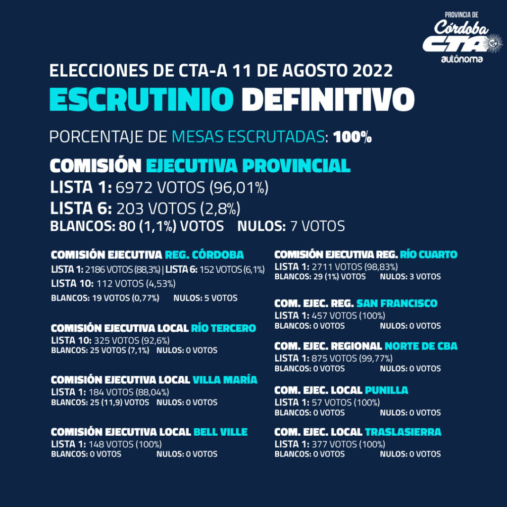 En tanto, la dirigente de ATE, Rafaela Alcoba, será la nueva Secretaria General de la CTA Autónoma Río Cuarto, con Marcelo Ortiz como Secretario Adjunto en representación del Cispren. Con 2711 votos la Lista 1 “Germán Abdala” reafirma el rumbo del nuevo modelo sindical, combativo y en las calles. El próximo equipo tendrá un gran componente de la FeNaT y Juventudes, y la participación de APECAF y el Sindicato de Trabajadores de la Vía Pública. “Reafirmamos el rumbo: Organizar el campo popular, con más articulación social y sindical, y sobre todo con una fuerte agenda feminista”, expresó Alcoba.