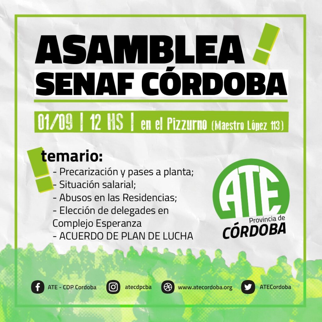 En el marco del conflicto que envuelve a la Secretaría de Niñez, Adolescencia y Familia (SENAF), el cuerpo de delegades de ATE convocó a participar de una nueva asamblea que se llevará a cabo a las 12 horas en el Complejo Pizzurno, Maestro López 113.
