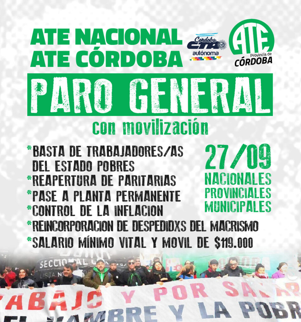 Tras la realización hoy de una reunión virtual del Consejo Directivo Nacional junto a las conducciones provinciales de ATE de todo el país, la Asociación Trabajadores del Estado ratificó la convocatoria al Paro Nacional que hubiera realizado hace 15 días y le puso fecha: será este 27 de septiembre y alcanzará a sectores Nacionales, Provinciales, Comunas y Municipios de todo el país. Cada región, a su vez, hará movilizaciones, cortes de calle, asambleas y demás medidas activas que consideren pertinentes en sus ámbitos locales/regionales.