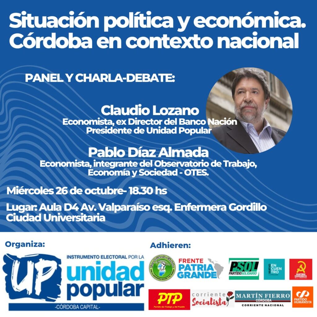 Con el objetivo de disertar sobre la realidad económica de Córdoba, el economista y presidente de Unidad Popular, Claudio Lozano, referente de la CTA y ex director del Banco Nación, encabeza un conversatorio hoy a las 18.30 horas en la Ciudad Universitaria, en un charla debate titulada “Situación política y económica. Córdoba en el contexto nacional”.