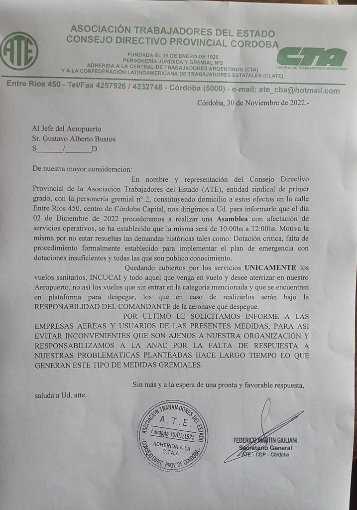 En el día de hoy Delegados de ATEANAC Córdoba notificaron a las autoridades de ANAC Argentina que mañana, de 10 a 12 horas, comenzarán a realizarse asambleas con afectación de los servicios operativos.