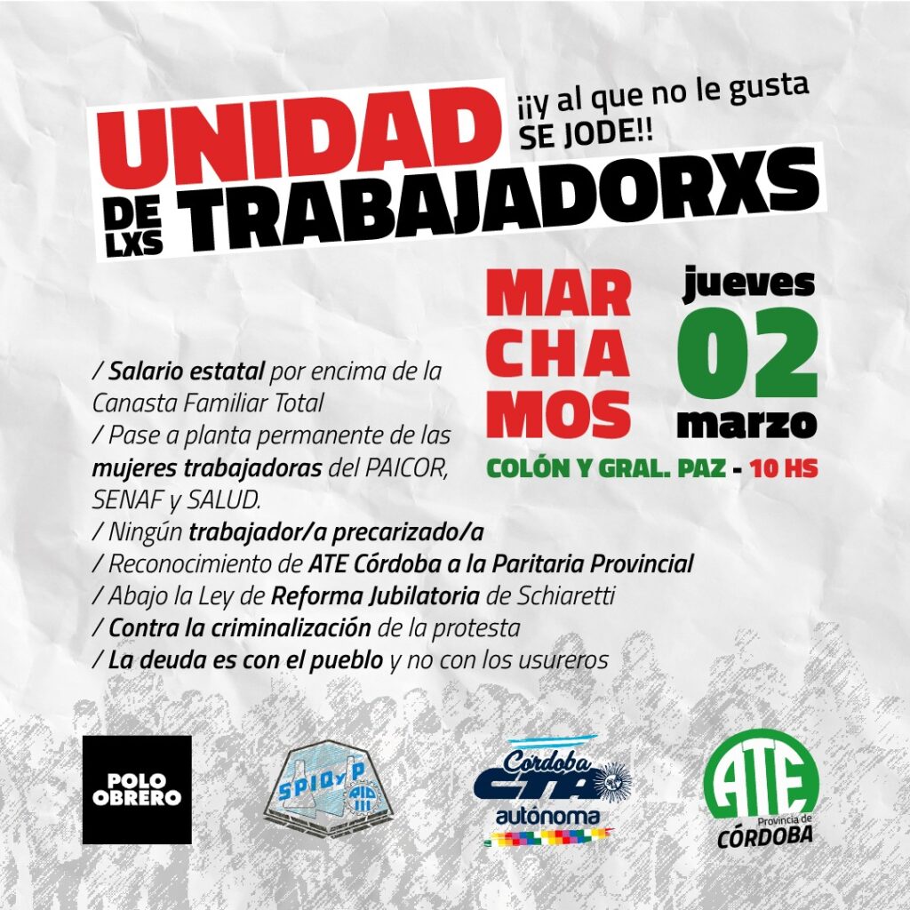 Y avanzó: “vamos a mostrar el alto nivel de conflictividad que hay hoy. Se sigue avanzando en la confianza política y la construcción, sabiendo que hay sectores que están faltando, que hay que seguir convocando porque con lo que hay no alcanza. Por eso se definió una nueva movilización en conjunto para vertebrar las peleas, que no se han saldado sino que se profundizan y que nos van a permitir marchar este jueves 2 de marzo. Están invitadas todas las organizaciones libres del pueblo que se banquen la lucha”.