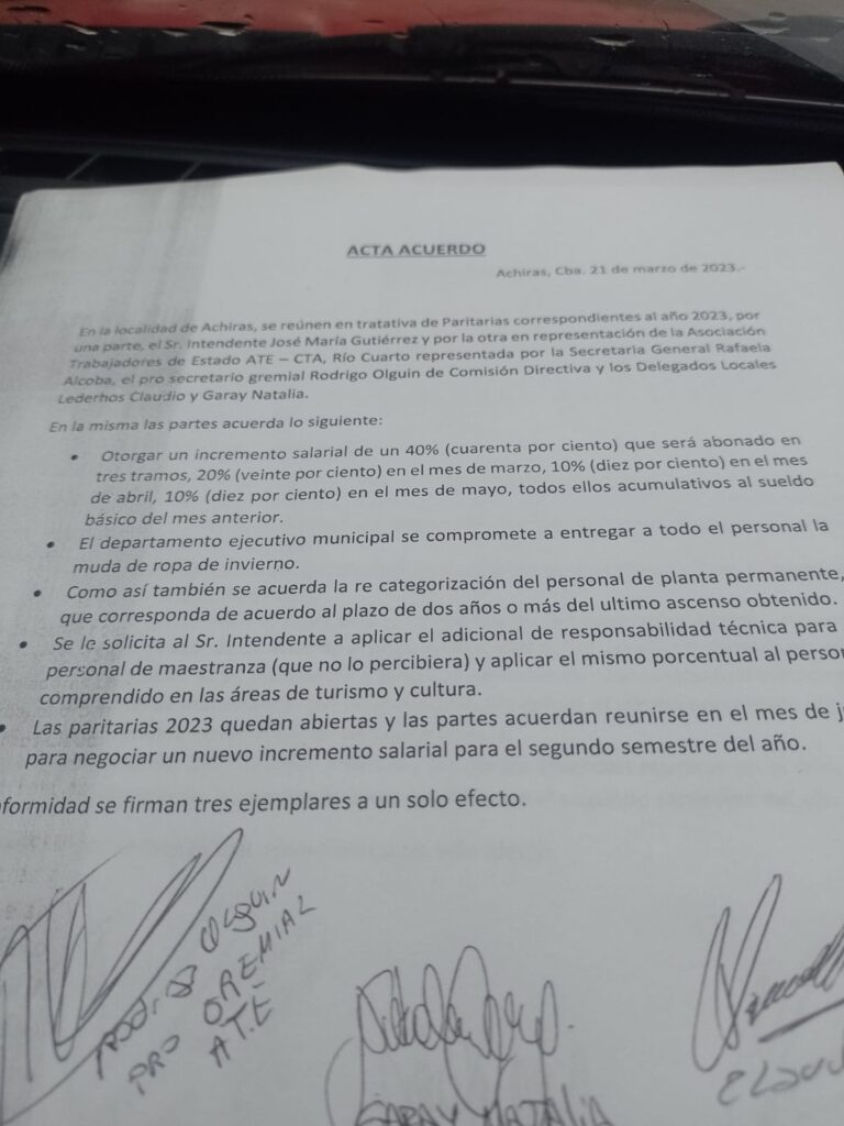 Hoy se llevó a cabo una reunión paritaria en al localidad de Achiras, donde se definió un aumentó salarial para el personal municipal de un 40% para el primer semestre del corriente año.
