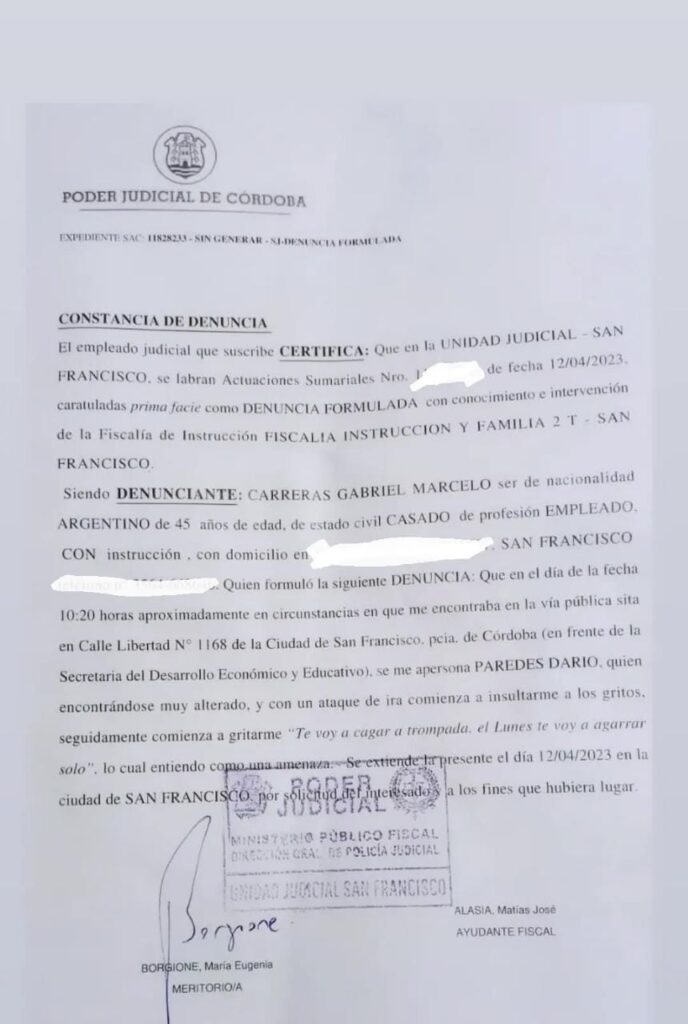 La Asociación Trabajadores del Estado (ATE-CTAA) repudia la actitud patotera del Secretario General de ATE San Justo, Darío Paredes, que amenazó al compañero Gabriel Marcelo Carreras por el simple hecho de que éste, como muchos otros, no comparte la idea de un gremio para pocos que pregona Paredes con acciones propias de un barra brava más que de un dirigente sindical.