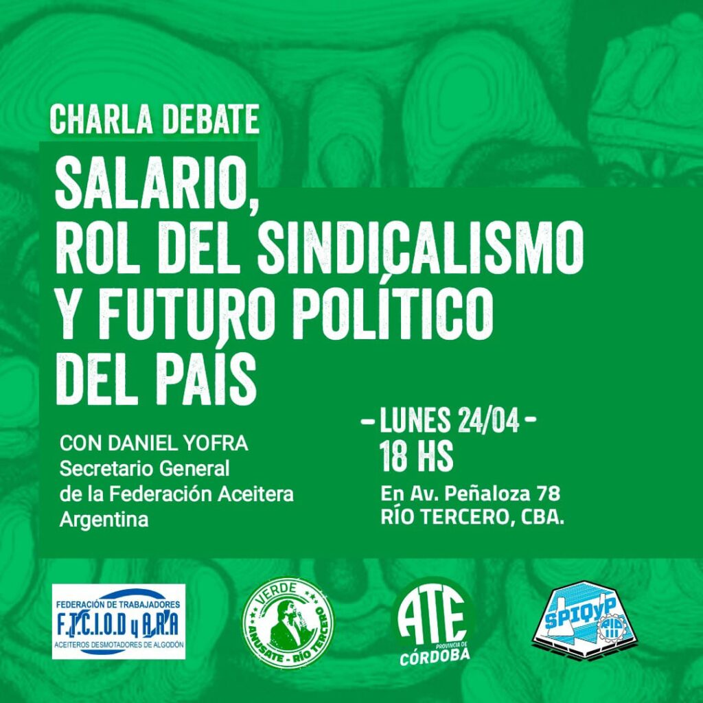 El próximo lunes, en la ciudad de Río Tercero, en Consejo Directivo Provincial organiza una importante charla-debate donde disertará el dirigente Daniel Yofra, secretario General de la Federación Aceitera Argentina (F.T.C.I.O.D y A.R.A).