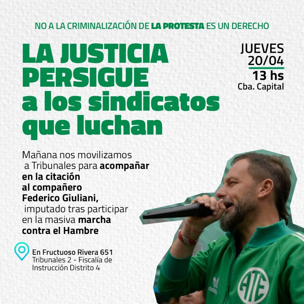 ATE Córdoba convoca a movilizarnos mañana jueves 20 de abril a las 13 horas para expresar nuestra solidaridad con el secretario General del Consejo Directivo Provincial, Federico Giuliani, imputado por la Justicia cordobesa por participar de una marcha en el centro de la ciudad.