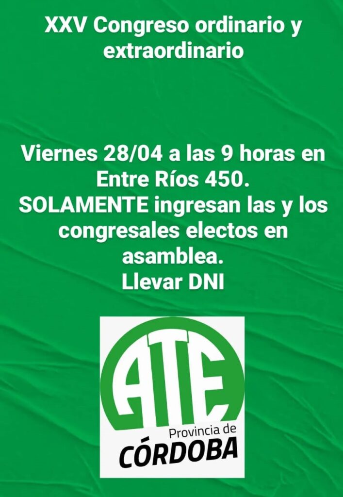 El próximo viernes 28 de abril, desde las 9 horas, se llevará a cabo el XXV Congreso Ordinario y Extraordinario de ATE Córdoba.