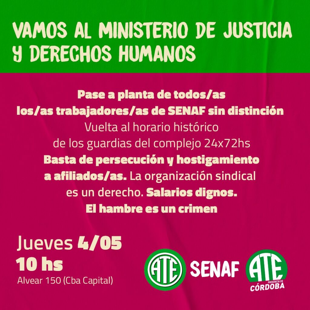 Las y los trabajadores de la Secretaría de Niñez, Adolescencia y Familia (SENAF) relanzaron su plan de lucha por mejoras laborales, salariales y en reclamo de mejoras urgentes en la atención de las niñeces atendidas en el organismo, luego que el Gobierno de Juan Schiaretti dejara sin respuestas cada uno de los reclamos interpuestos por ATE en una presunta Mesa de Diálogo creada el año pasado por el Ministerio de Justicia, orquestada solo a los fines de desmovilizar al sector, sin resolver ninguno de los graves problemas existentes.