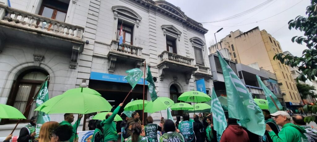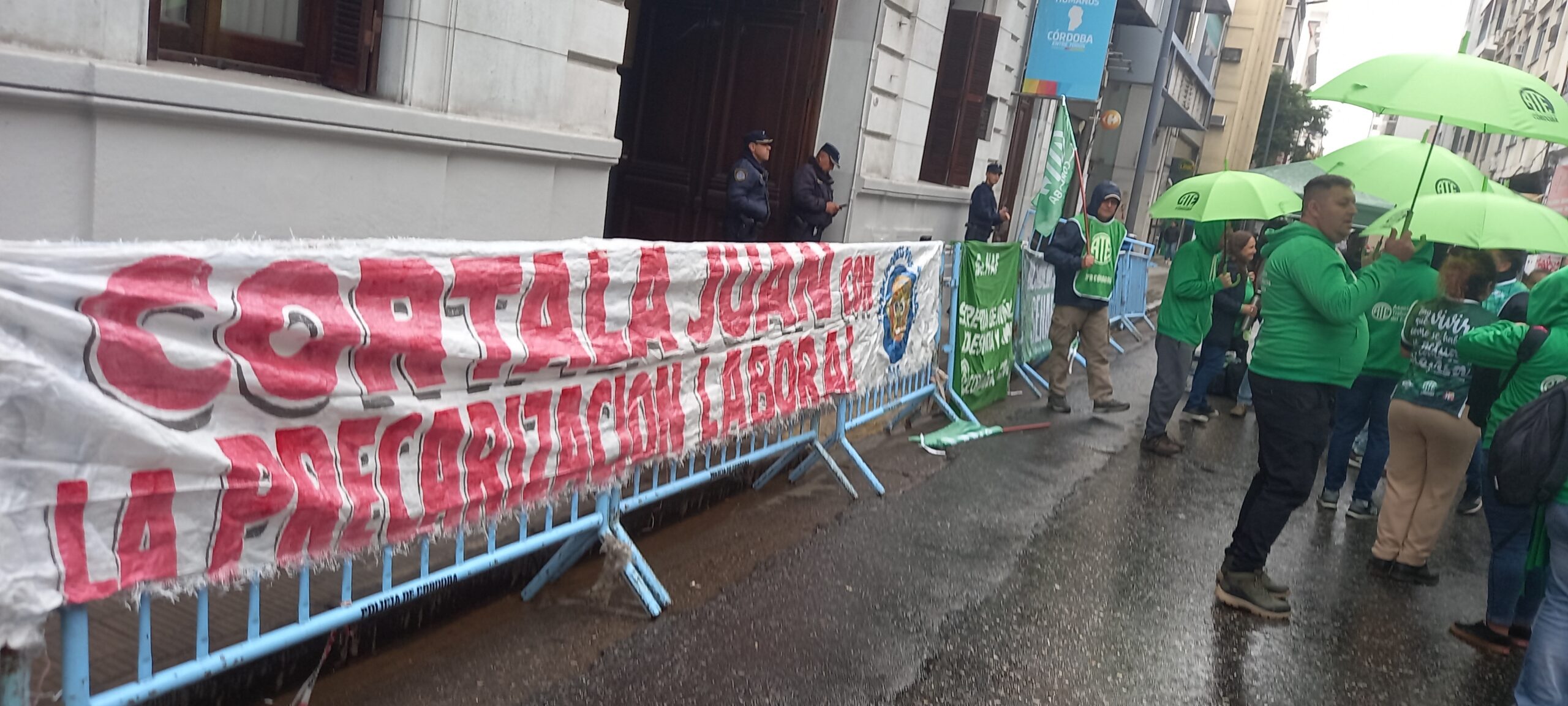 A pesar de lluvia, que de a ratos caía sobre le centro de la ciudad, la columna de ATE corto la calle Alvear a la Altura del Ministerio e hizo sonar un fuerte bullicio, mientras los funcionarios se escondían detrás de los cortinados y la guardia policial.