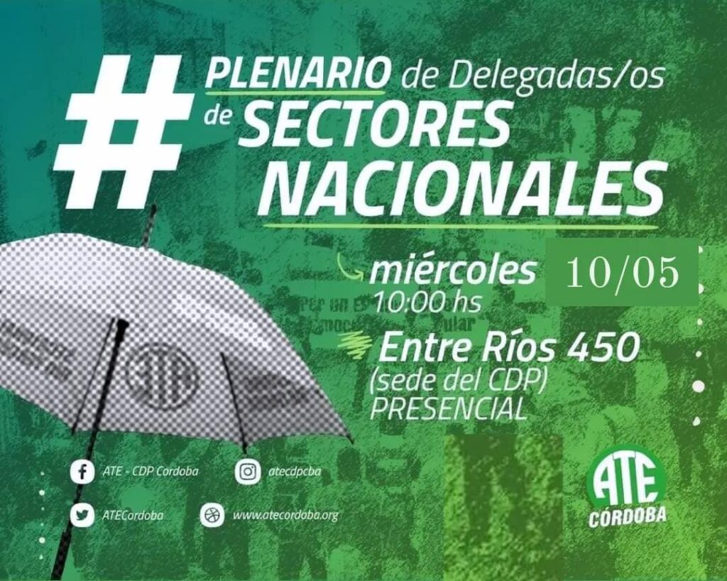 El próximo miércoles 10 de mayo, a las 10 horas, se llevará a cabo un plenario de delegadas y delegados de organismos nacionales en la sede de ATE Córdoba, Entre Ríos 450.
