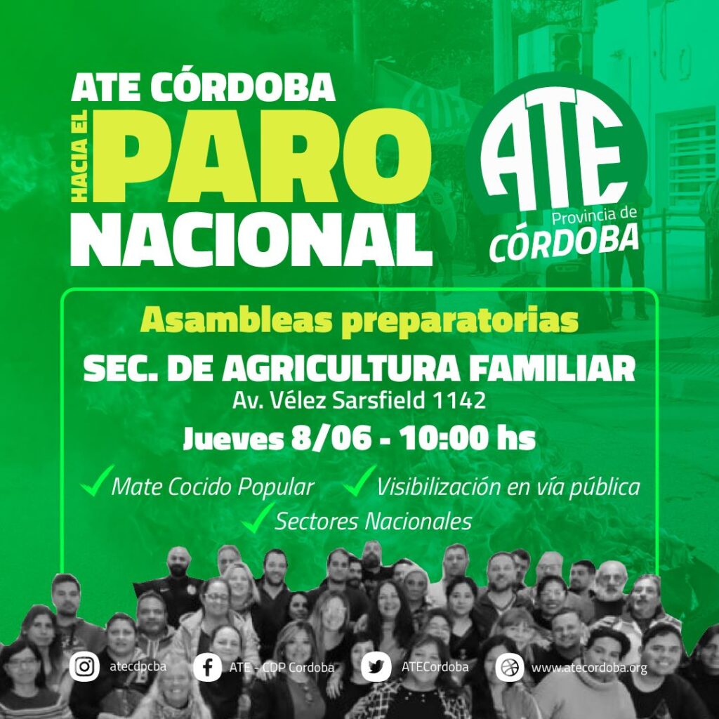 En el marco de las acciones que ATE Córdoba viene desarrollando “prendiendo la llamita del plan de lucha”, como dijo en el ultimo plenario de delegado de organismos nacionales en Córdoba nuestro secretario General Federico Giuliani, mañana se realizará una protesta frente a las oficiales de Agricultura Familiar de la Nación, frente a las Plaza de las Américas, en Ambrosio Olmos y avenida Vélez Sarsfield, a partir de las 10 horas.