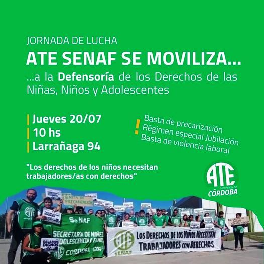 Mañana ATE llevará a cabo una jornada de lucha en la Secretaria de Niñez, Adolescencia y Familia (SENAF), llevando el reclamo por la precarización laboral y las pésimas condiciones de trabajo a la Defensora de los niños, niñas y adolescentes, Amelia López, sumado a la vulneración permanente de los derechos de las infancias y juventudes que se encuentran en guarda en el organismo.