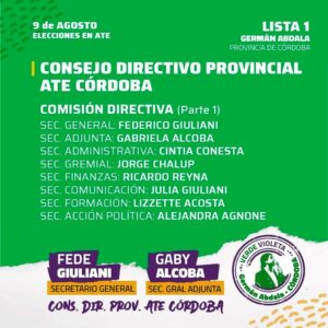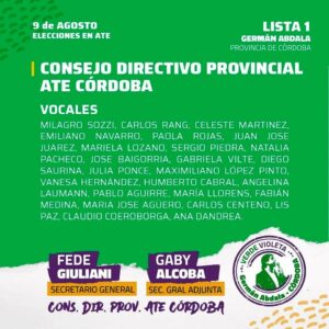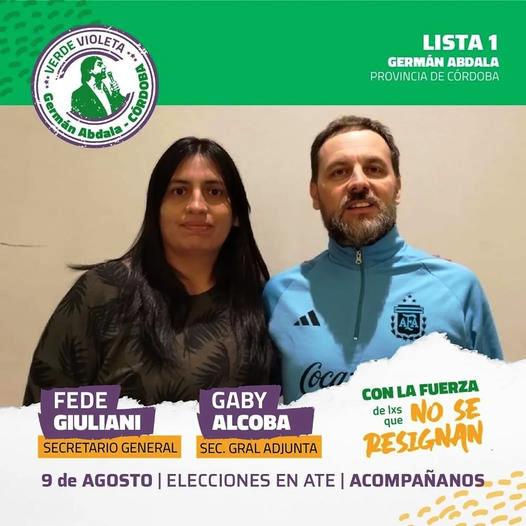 “Este 9 de agosto, vamos con la Lista 1 Verde y Violeta de Germán Abdala en ATE Córdoba. Nos conocés por lo que hicimos estos 4 años. Consolidemos el rumbo y este proyecto gremial transformador.