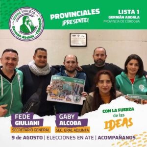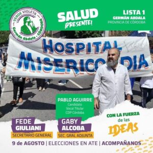“Somos la Verde y Violeta. La actual conducción de ATE que te propone este 9 de agosto votar para que sigamos creciendo juntos con este gremio combativo, que gestiona y acompaña a las y los afiliados. Pablo Aguirre forma parte de nuestra lista. Referente de salud y trabajador del Hospital Misericordia se sumó a este equipo que sigue caminando”.