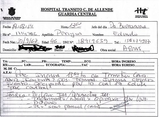 Según el diagnóstico firmado por el médico Carlos Mulqui, como resultado de la agresión Pereyra resultó con Traumatismo nasal y epitasis leve, con riesgo de fractura por lo que el compañero debió realizarse una placa y derivado para una TAC de cráneo por cefalea.