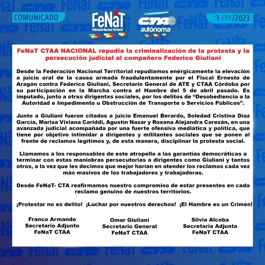 Los abajo firmantes delegados, integrantes de la CTA A PUNILLA, dejamos expresa nuestra solidaridad con el Secretario General de la Comisión Directiva provincial, el compañero Federico GIULIANI, tras el pedido de elevación a juicio por su adhesión como orador en la marcha contra el hambre realizada el pasado 5 de abril acusándolo de Desobediencia a la Autoridad e Impedimento u Obstrucción de Transporte o Servicios Públicos.
