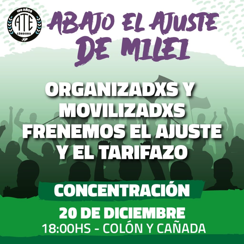 Bajo el lema “Nos movilizamos contra la motosierra de Milei y sus aliados”, ATE Córdoba Y la CTA Autónoma convocan a la manifestación que se llevará a cabo este miércoles 20 de diciembre, en un nuevo aniversario de la pueblada que le puso punto final en 2001 al Gobierno antinacional y antipopular de Fernando De la Rúa y Domingo Cavallo, del mismo signo neoliberal que el que actualmente replican Milei, Macri y compañía.