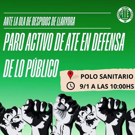 ATE Córdoba convoca para mañana 9 de enero a Paro Activo en el Estado provincial, en rechazo a los despidos en el Estado Provincial decididos por el Gobernador Martín Llaryora, en sintonía con la “motosierra” puesta en marcha por el neoliberal y apátrida Javier Milei para poner una bandera de remate al país.