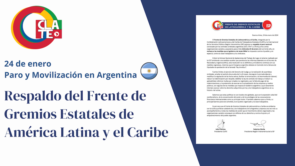 A través de un comunicado que lleva las firmas de Julio Fuentes, presidente de la CLATE y Federico Dávila, presidente de la Región Interamérica de la ISP, el Frente que reúne a gremios de trabajadoras y trabajadores del Sector Público de América Latina y el Caribe brinda su respaldo a la medida de fuerza convocada por las centrales sindicales argentinas (CGT, CTA-T y CTA-A) junto a otras organizaciones sociales y populares para el día miércoles 24 de enero del corriente año mencionando las siguientes resoluciones: