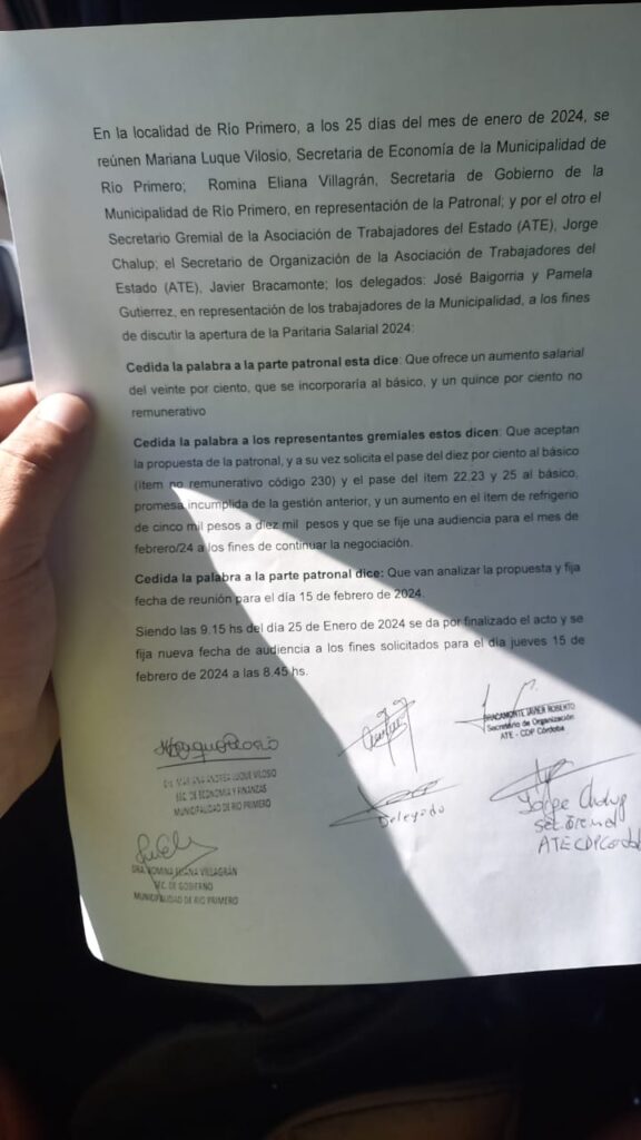 Hoy se llevó adelante una reunión paritaria en la municipalidad de Río Primero donde se definió un aumento salarial para el personal municipal del 35% para el primer semestre del corriente año.