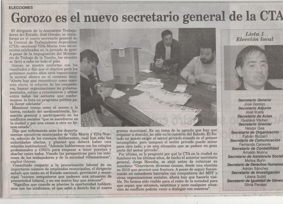 La Agrupación Germán Abdala se impuso en toda la provincia por más del 90% de los votos emitidos. El dirigente de prensa reemplaza a nuestro histórico secretario General Cacho Mengarelli y tendrá como adjuntos a Luís Bárcena, de ATE, y Raúl Gómez, docente universitario de la Corriente Sindical del MST. Dreizik felicitó a la militancia por el esfuerzo realizado para la elección.