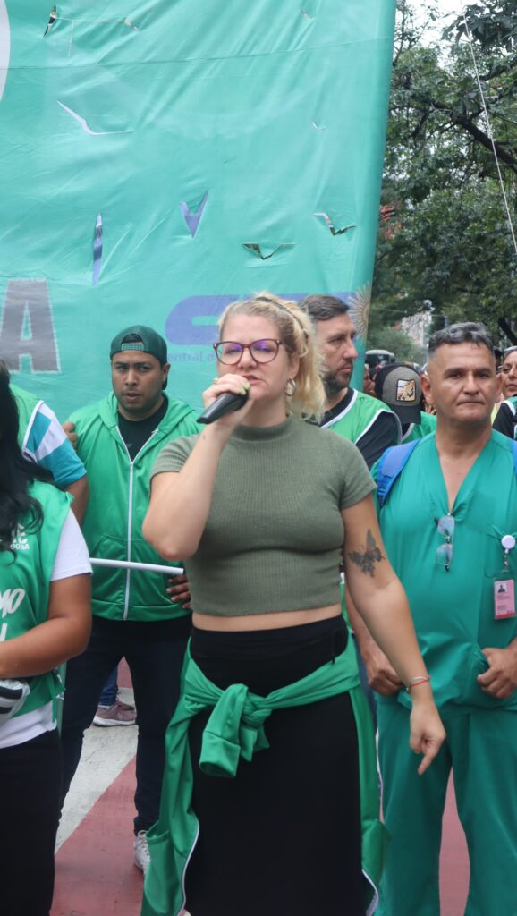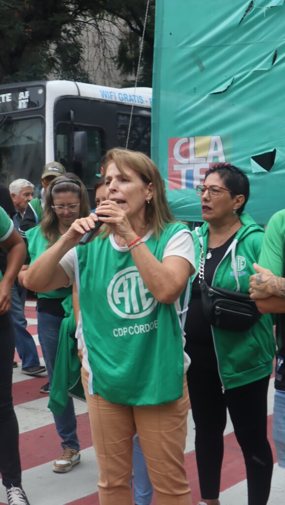 Las mujeres estatales también alzaron su voz. Entre las varias dirigentes que participaron de los discursos, la vocal Nacional de ATE, Julia Giuliani, remarcó que “la calle es nuestro lugar, por más que nos bombardearon y nos acribillaron, seguimos de pie defendiendo derechos”.