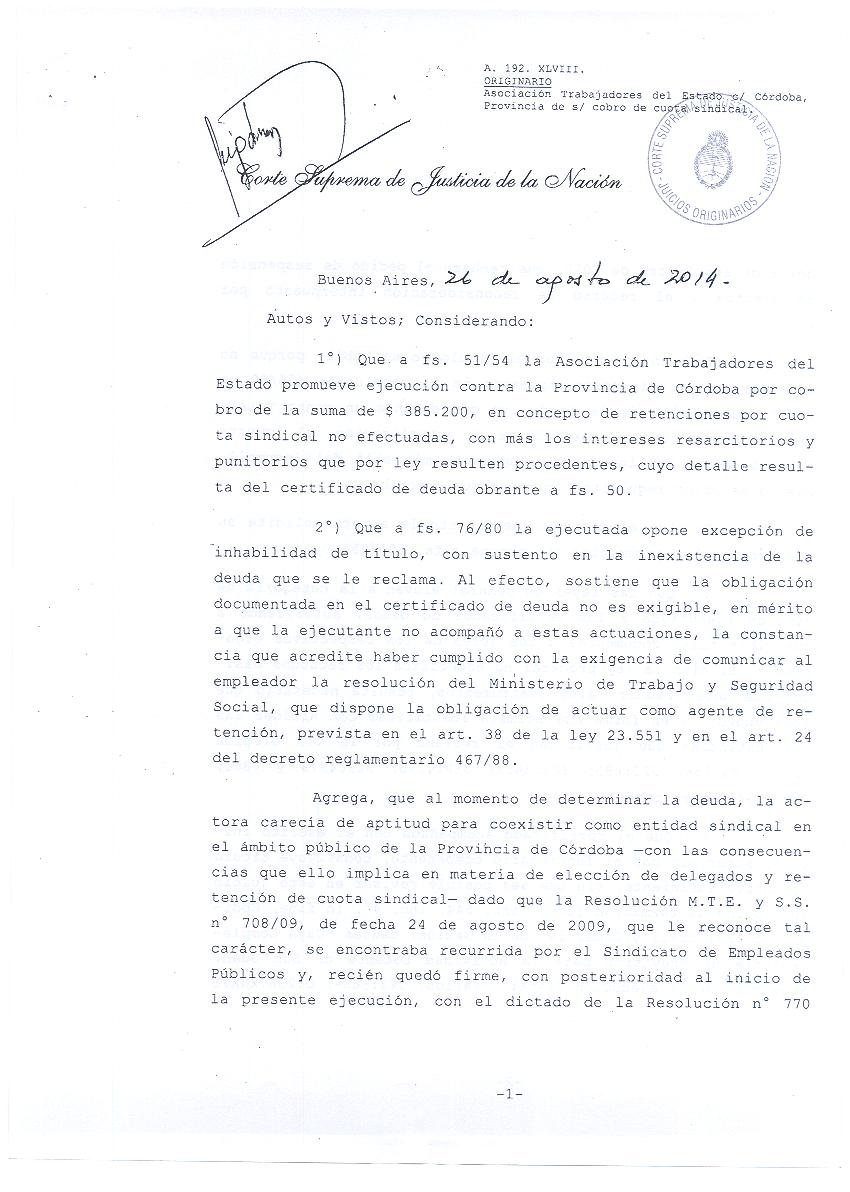 La conducción de ATE Córdoba dio a conocer hoy el fallo de la Corte Suprema de Justicia de la Nación, emitido el pasado el 26 agosto, que ratifica la representación de la Asociación Trabajadores del Estado de los trabajadores estatales que se desempeñan en el Gobierno provincial.