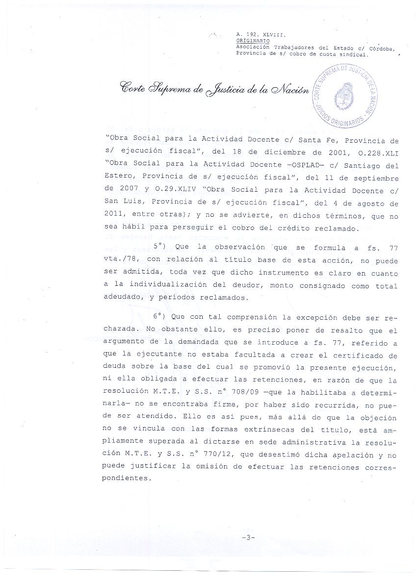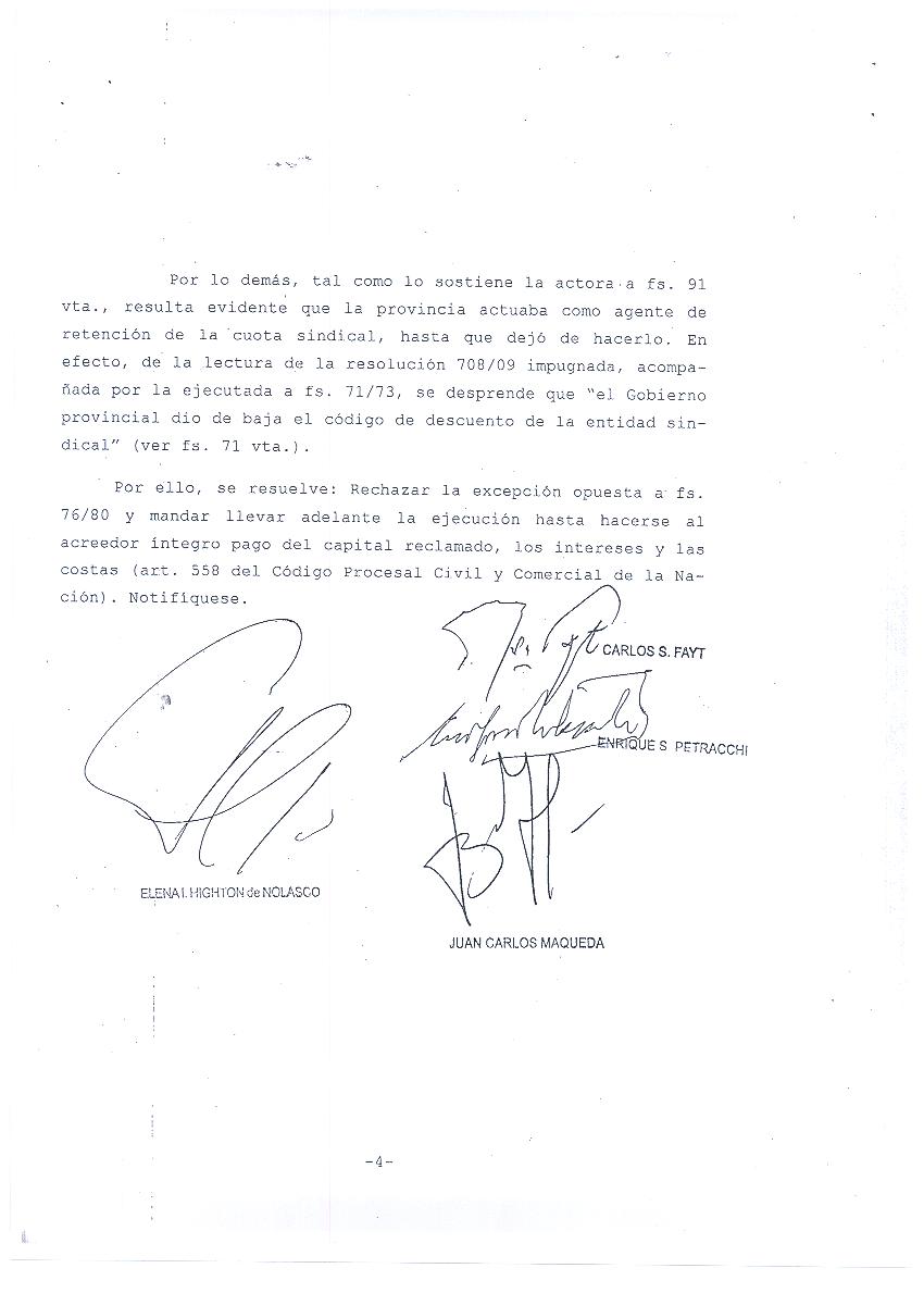 Con la firma de los jueces Juan Carlos Maqueda, Elena Highton de Nolasco, Enrique Petracchi y Carlos Fayt, la Corte fundamentó su decisión en el art. 38 de la Ley de Organizaciones Sindicales 23.551 que establece que “los empleadores estarán obligados a actuar como agentes de retención de los importes que, en concepto de cuotas de afiliación u otros importes deban tributar los trabajadores a las asociaciones sindicales de trabajadores con personería gremial (…). El incumplimiento por parte del empleador de obrar como agente de retención, o en su caso de efectuar en tiempo propio el pago de lo retenido, tornará a aquel en deudor directo. La mora en tal caso se producirá de pleno derecho”.