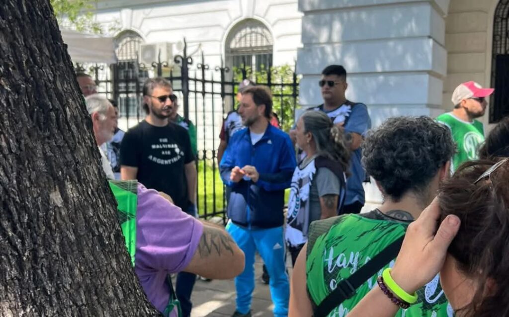 “No a los despidos en la era Milei, inmediata reincorporación de las y los trabajadores despedidos injustamente, decimos no al vaciamiento del estado, no a la privatización de las empresas públicas”, reclamó Giuliani frente a la sede de CNEA.