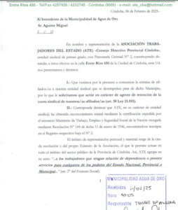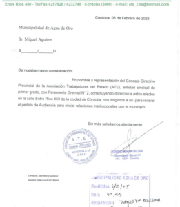 En una nota dirigida al intendente de Agua de Oro Miguel Aguirre, localidad ubicada en el corredor de las Sierras Chicas, el Consejo Directivo Provincial presentó la nómina de las y los municipales de la localidad afiliados a nuestra gremio y solicitó al Ejecutivo actúe como agente de retención de la cuota sindical, tal como lo establece la Ley de Asociaciones Sindicales.