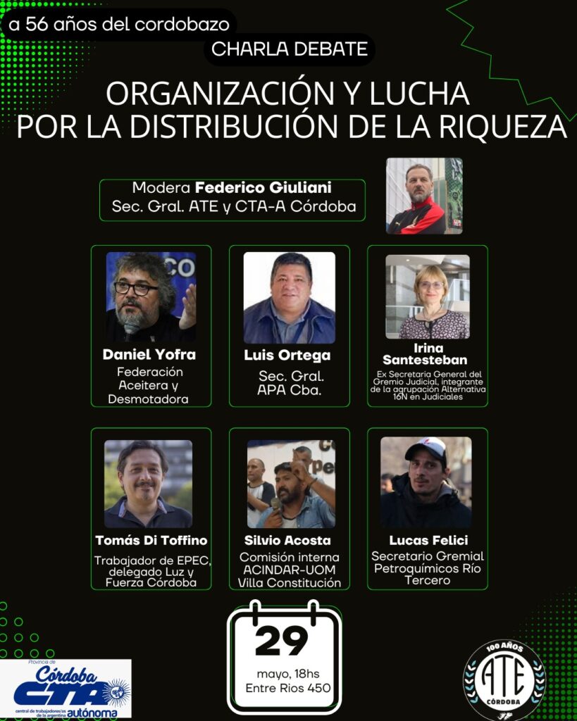 Ante el necesario debate sobre la intervención del sindicalismo combativo en la actualidad y en homenaje a las gloriosas jornadas del Cordobazo, ATE Córdoba convoca a participar de la charla.debate titulada “Organización y Lucha por la Distribución de la Riqueza”, con la participación de destacados dirigentes sindicales de Córdoba y distintos puntos del país, de cara al 56 aniversarios de la gesta obrero estudiantil.
