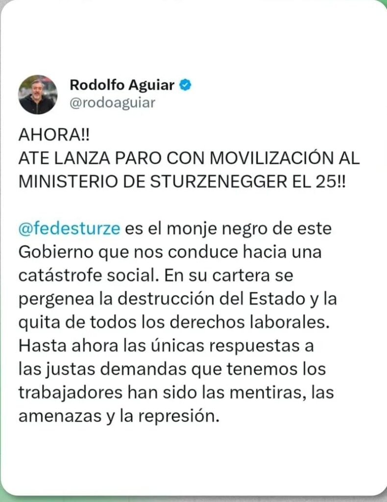 “Sturzenegger es el monje negro de este Gobierno que nos conduce hacia una catástrofe social. En su cartera se pergeña la destrucción del Estado y la quita de todos los derechos laborales. Hasta ahora las únicas respuestas a las justas demandas que tenemos los trabajadores han sido las mentiras, las amenazas y la represión”, señaló Rodolfo Aguiar, Secretario General de ATE Nacional.