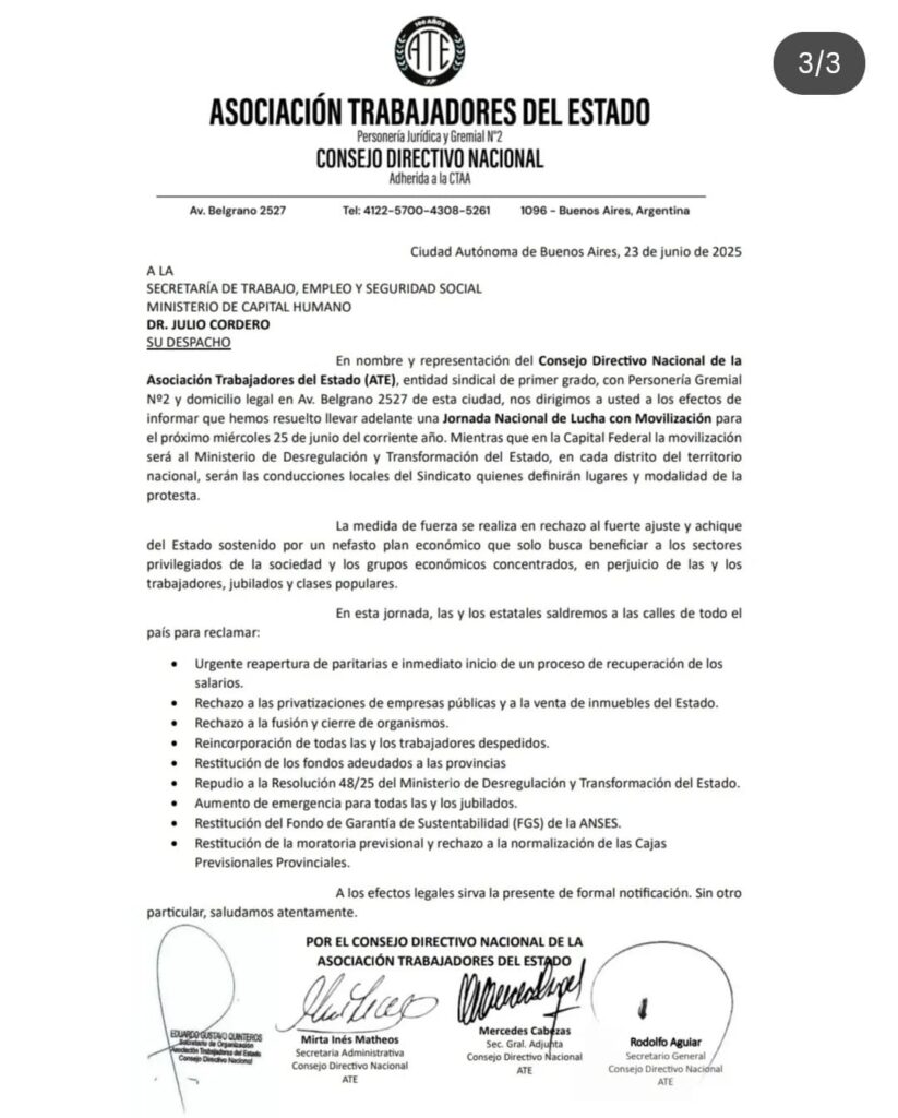 ATE lanzó una Jornada Nacional de Lucha para este miércoles 25 de junio con movilización al Ministerio de Desregulación y Transformación del Estado que conduce Federico Sturzenegger.