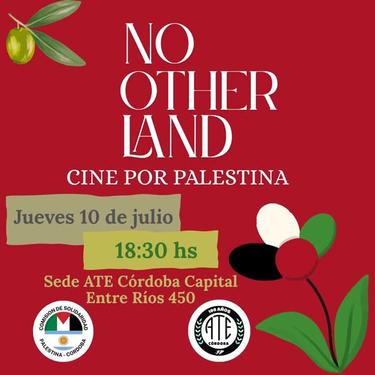 La Comisión de Solidaridad con Palestina de Córdoba y ATE Córdoba invitan a la proyección de la película “No Other Land” en el ciclo de cine-debate Cine por Palestina, a realizarse hoy jueves 10 de julio, a las 18:30 horas, en la sede del Consejo Directivo Provincial, Entre Ríos 450, Córdoba Capital.