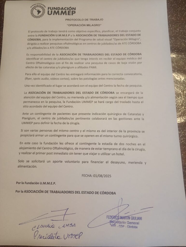 Con la firma de nuestro secretario General Federico Giuliani y de Claudia Camba, presidenta de la Fundación UMMEP (Un Mundo Mejor Es Posible) que inauguró la cooperación cubana en nuestro país, ATE y la CTAA Córdoba suscribieron un convenio para la atención de jubilados y jubiladas afiliadas con enfermedades oculares, como cataratas y pterigion, en la Clínica Ernesto Che Guevara, ubicada en Córdoba Capital.
