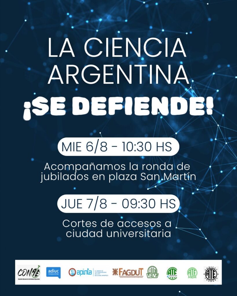 La mesa Sindical de Ciencia y Técnica será parte esta semana de protestas y movilizaciones callejeras en Córdoba como las Ronda de las/os Jubilados que se realiza en Plaza San Martín, este próximo miércoles 6 de agosto, y los cortes de arterias de ingreso de la Ciudad Universitaria, en el marco del plan de lucha que desarrolla la comunidad universitaria en la UNC.