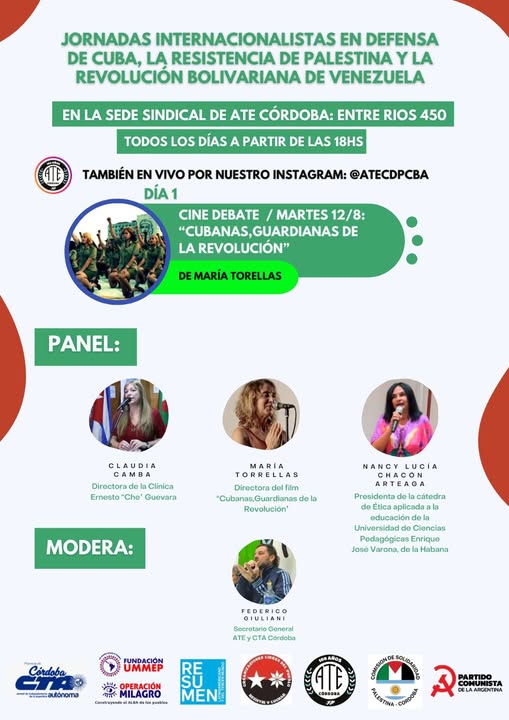 La jornada contará con un panel de lujo, integrado por Claudia Camba, directora de la Clínica Ernesto “Che” Guevara, María Torrellas, directora de la película, Nancy Lucía Chacón Arteaga, presidenta de la Cátedra de Ética Aplicada, Universidad de Ciencias Pedagógicas y Enrique José Varona (La Habana), con la moderación del secretario General de ATE Córdobas, Federico Giuliani.
