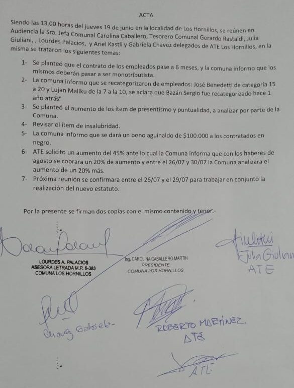 “Si bien entendemos el contexto económico nacional y provincial actual que condiciona las finanzas municipales, también sabemos que aquellos que se postulan para conducir los destinos de Los Hornillos tienen las condiciones para gestionar los recursos necesarios para que la Comuna continúe funcionando, lo cual exige salarios dignos para el plantel de trabajadores, es una de las responsabilidades de Carolina Caballero. Esto generó una tensión porque, además, firmamos el acta acuerdo y después no lo cumplió: solo pagó el 10%”, sostuvo.