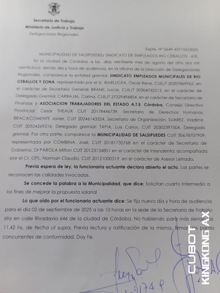 Hoy se desarrolló una nueva audiencia paritaria en la Secretaria de Trabajo de las provincia, entre la Municipalidad de Salsipuedes y la representación gremial integrada por ATE y el sindicato municipal.