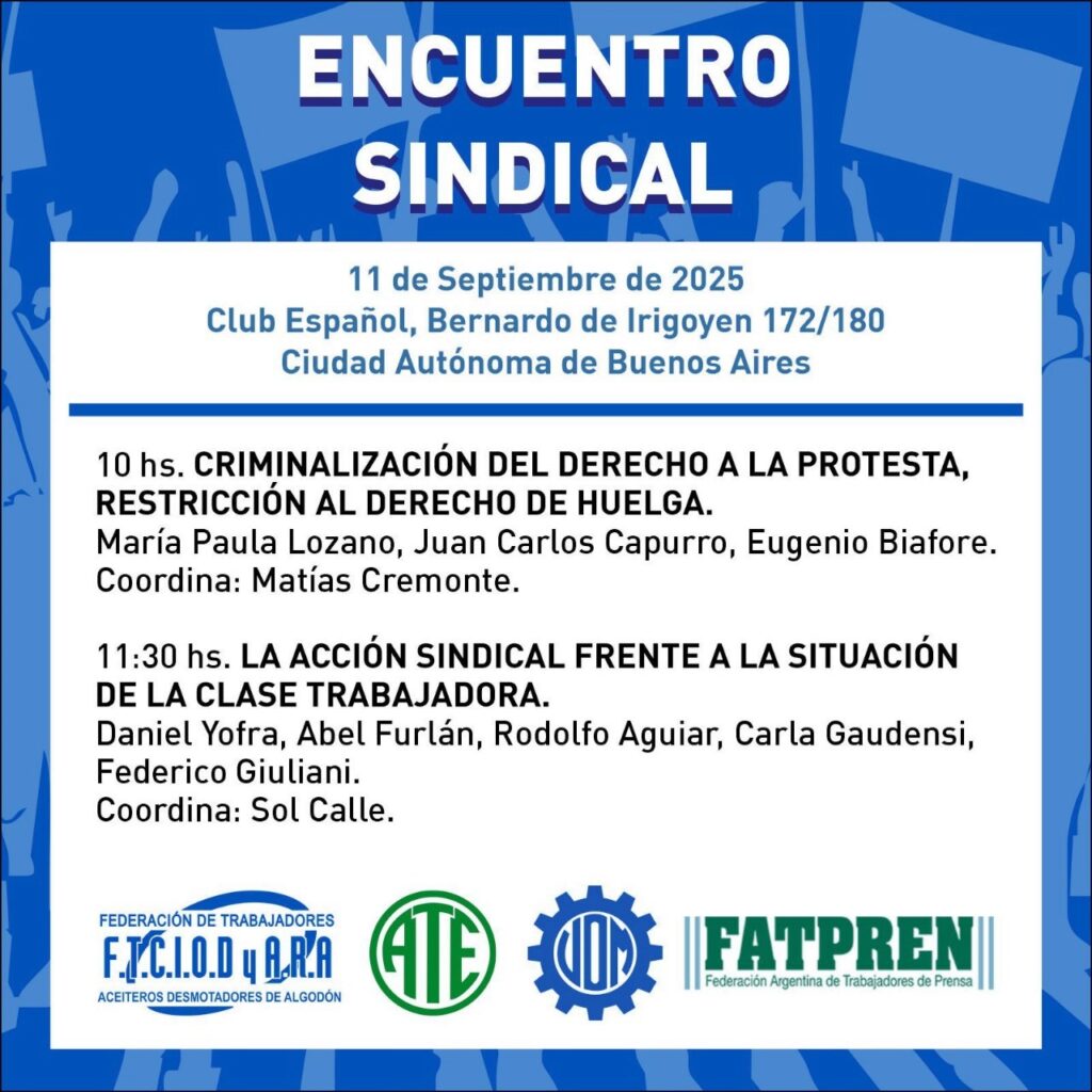 El Secretario General de ATE y la CTA Autónoma Córdoba, Federico Giuliani, junto al Secretario General de la ATE Nacional, Rodolfo Aguiar, integran el panel de dirigentes del Encuentro Sindical que tendrá lugar este jueves 11 de septiembre en el Club Español, Bernardo de Irigoyen 172/180, de Capital Federal.