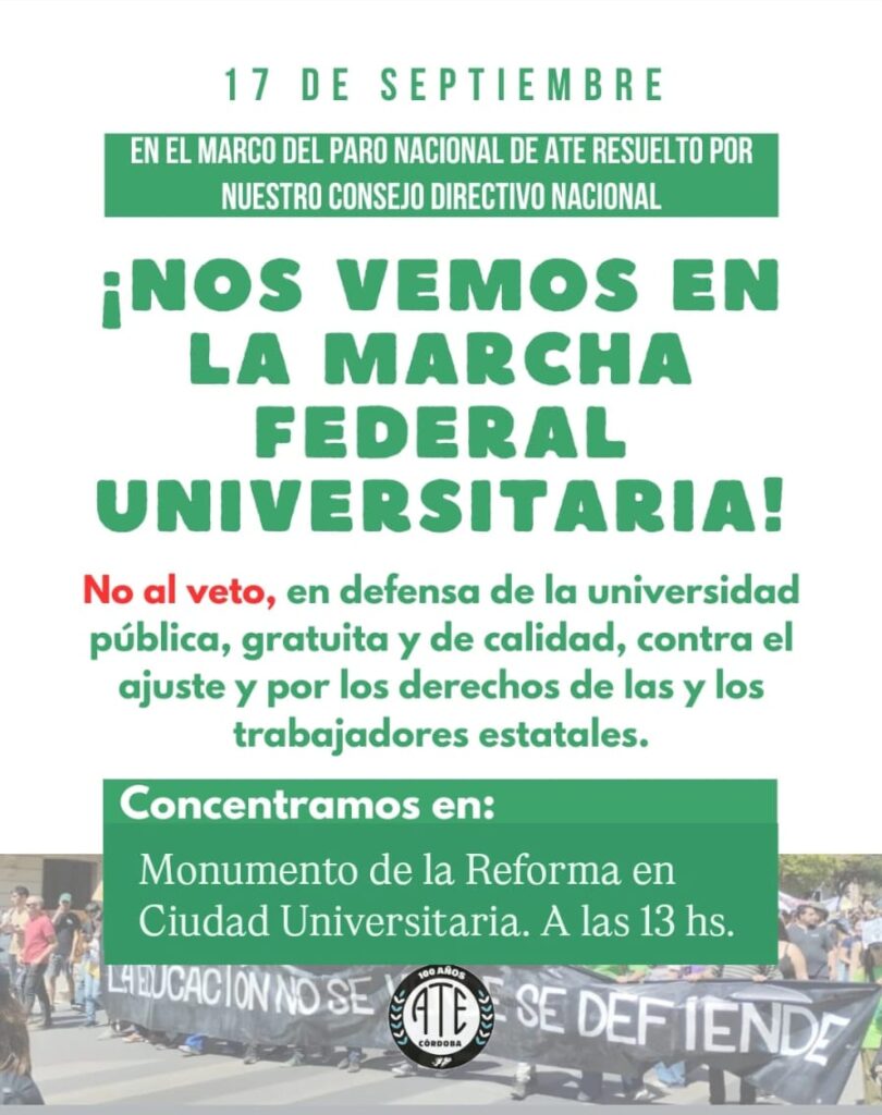 Desde ATE Córdoba decimos presente en esta Marcha Federal Universitaria convencidos de que la universidad pública es patrimonio del pueblo argentino y que su defensa es inseparable de la defensa de los derechos de las y los trabajadores.