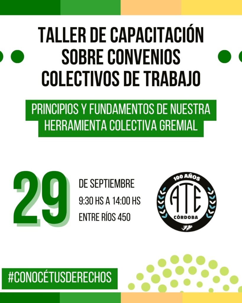 En le marco de las políticas de formación de dirigentes, activistas y delegados/as del Estado, el Consejo Directivo Provincial (CDP) de ATE Córdoba invita a participar del taller de capacitación sobre Convenios Colectivos de Trabajo, que se desarrollará el próximo lunes 29 de septiembre, de 9.30 a 14 horas.