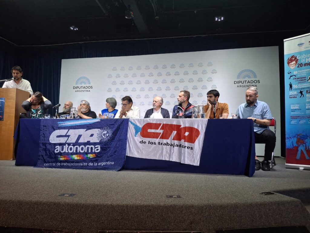 “Quiero agradecer por la invitación y la posibilidad de traer nuestra voz al Congreso de la Nación, la máxima instancia deliberativa y legislativa que tiene nuestra Nación y que debería ser la caja de resonancia de lo que pasa en la calle, sobre todo en los momentos de avance del fascismo como lo tenemos en la Argentina”, comenzó Giuliani, acompañado en el panel por el secretario General de la CTAA, Hugo Godoy y su par de la CTA de los Trabajadores, Hugo Yaski.