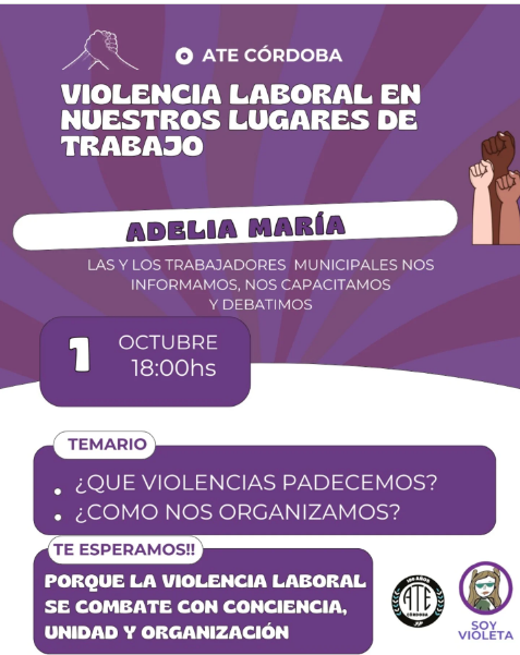 Hoy a las 18 horas se llevará a cabo un nuevo taller sobre violencia laboral. En la ocasión la actividad se realizará en la localidad de Adelia María en el sur provincial, dictado pro integrantes del Consejo Directivo Provincial.